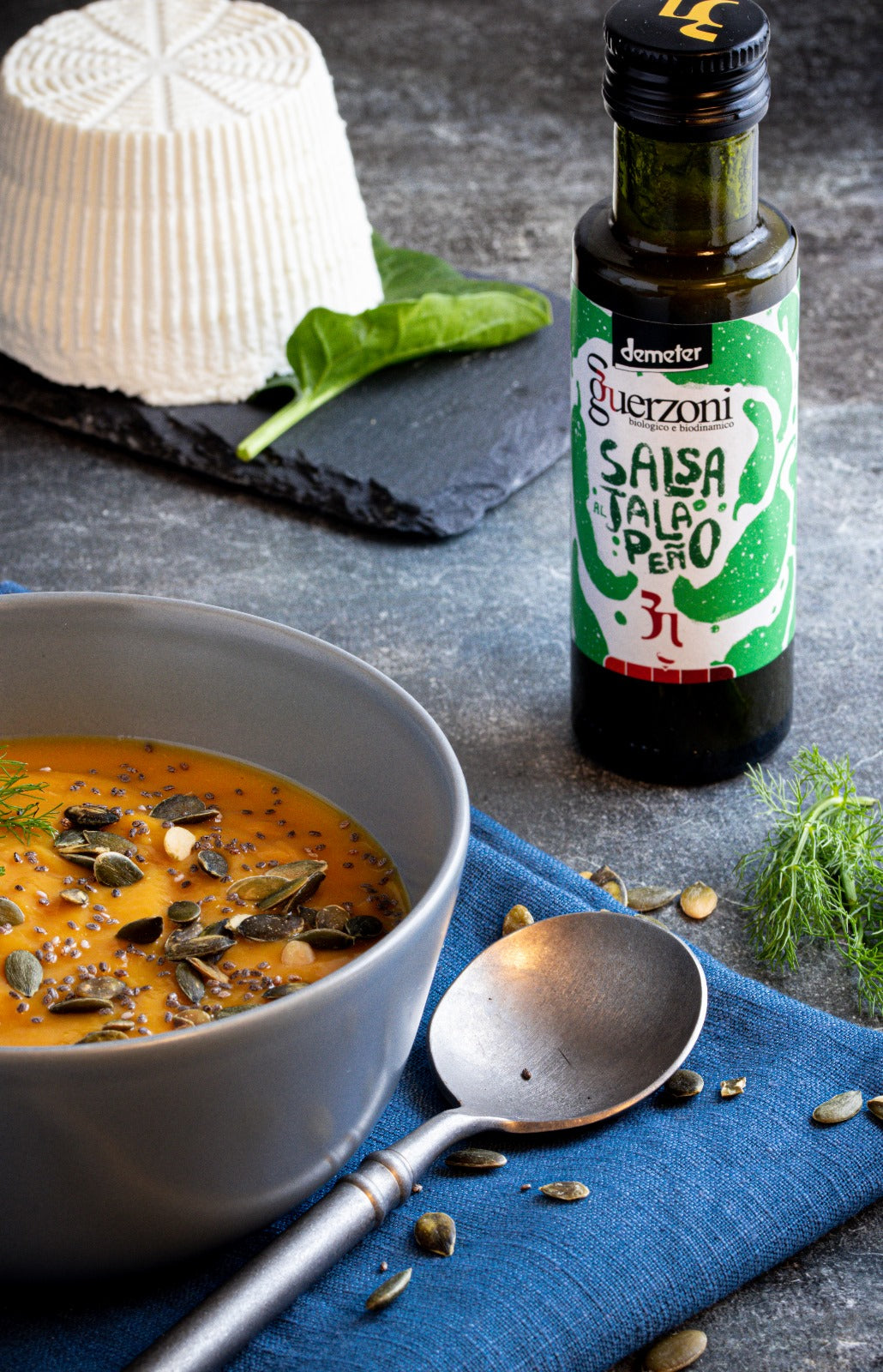 Crème de potiron et carottes avec ricotta fraîche et sauce jalapeño verte de Acetaia Guerzoni
